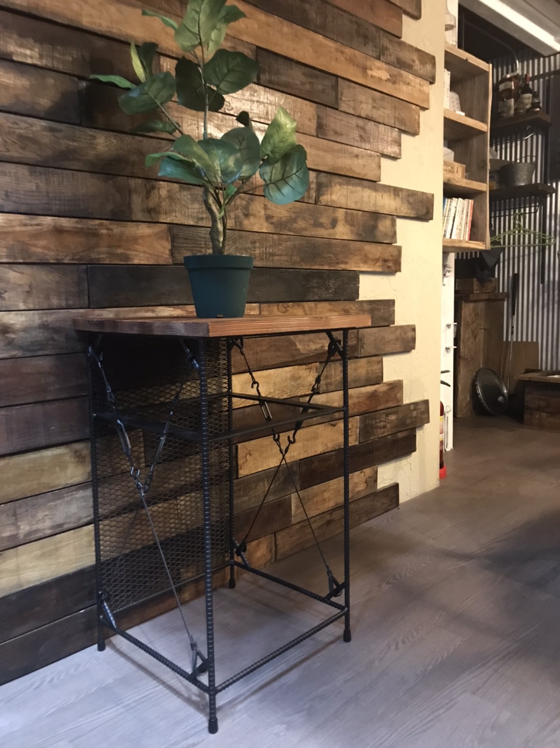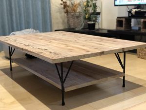 表面の凸凹を活かして、好きなサイズの テーブル板と合わせた製品です。 ちょっとした物が置けるように二段にしました。